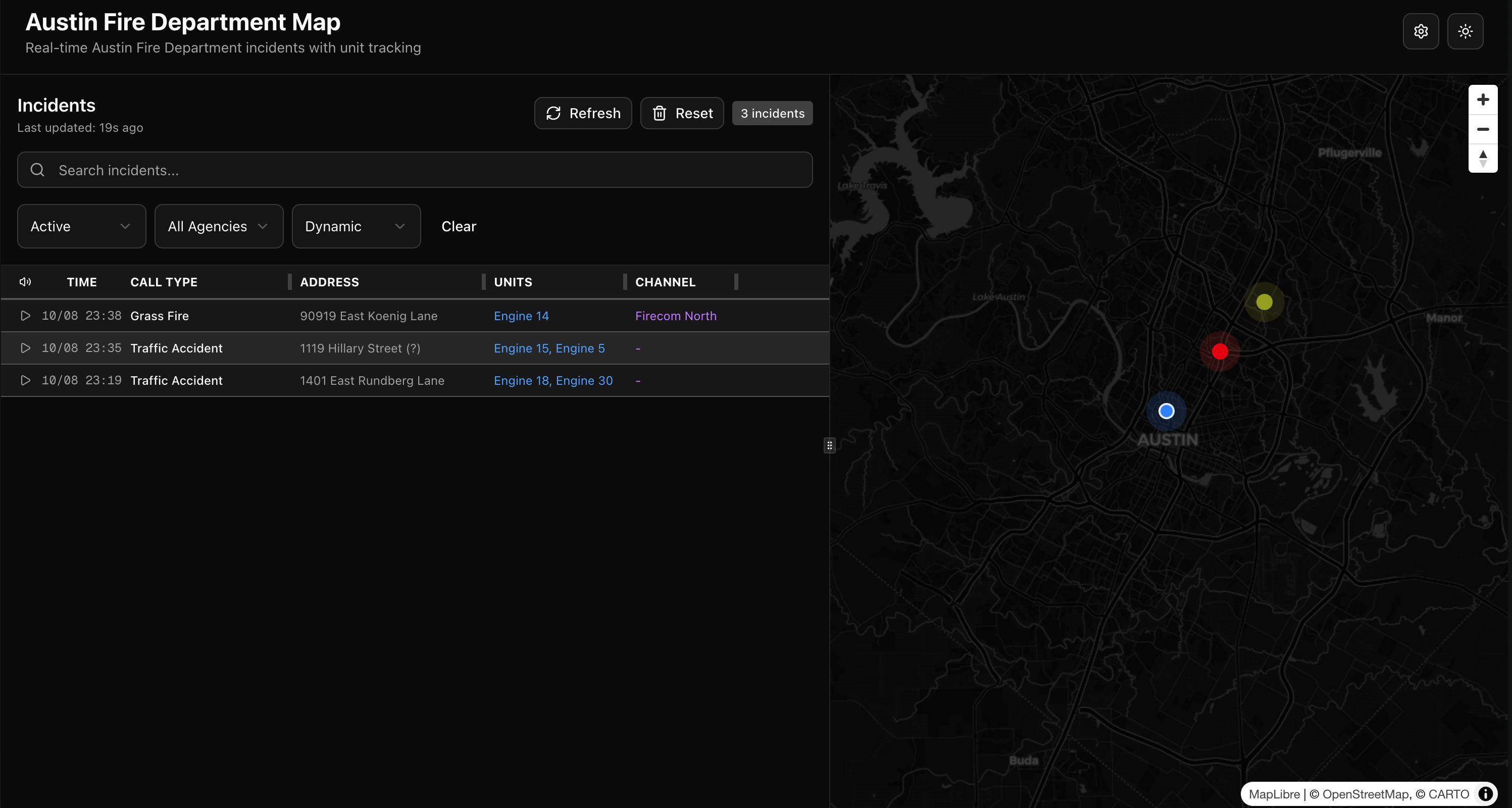 Real-time Austin Fire Department incidents with unit tracking using Broadcastify and OpenAI APIs. I always wondered where different fire apparatuses were going around the city, so I made this small passion project to see calls and the assigned units! Very cool to combine my passion in CS with my passion for firefighting.
